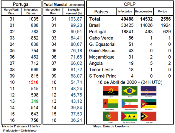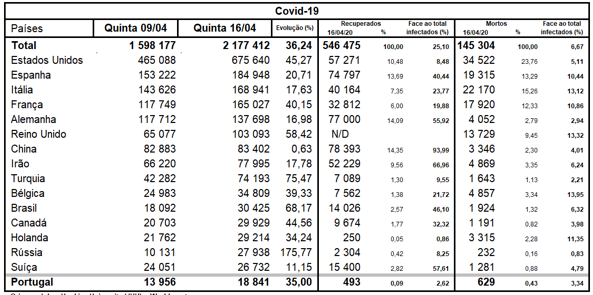 Covid-19 – Evolução semanal do número de infectados a nível mundial às 24 horas do dia 16 de abril dos principais países afectados